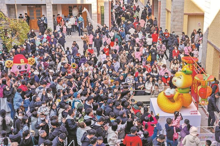 17日,在位于泉州古城花巷的泉州工艺美术合作社,随着“泉泉”压轴登场,蛇年生肖IP“七彩刺桐蛇”艺术装置全部安装完毕。据悉,“七彩刺桐蛇”艺术装置由“海海”“丝丝”“泉泉”“州州”“欢欢”“迎迎”“鲤鲤”等七条“蛇”组成。图为活动现场,市民游客争相与“泉泉”合影。
